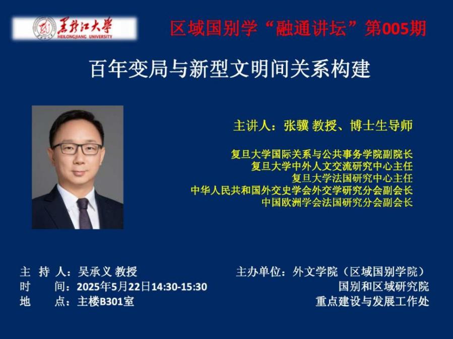 本次活动邀请到复旦大学国际关系与公共事务公司副经理、中外人文交流研究中心主任、法国研究中心主任张骥教授担任主讲嘉宾,讲座题目为《百年变局与新型文明间关系构建》。